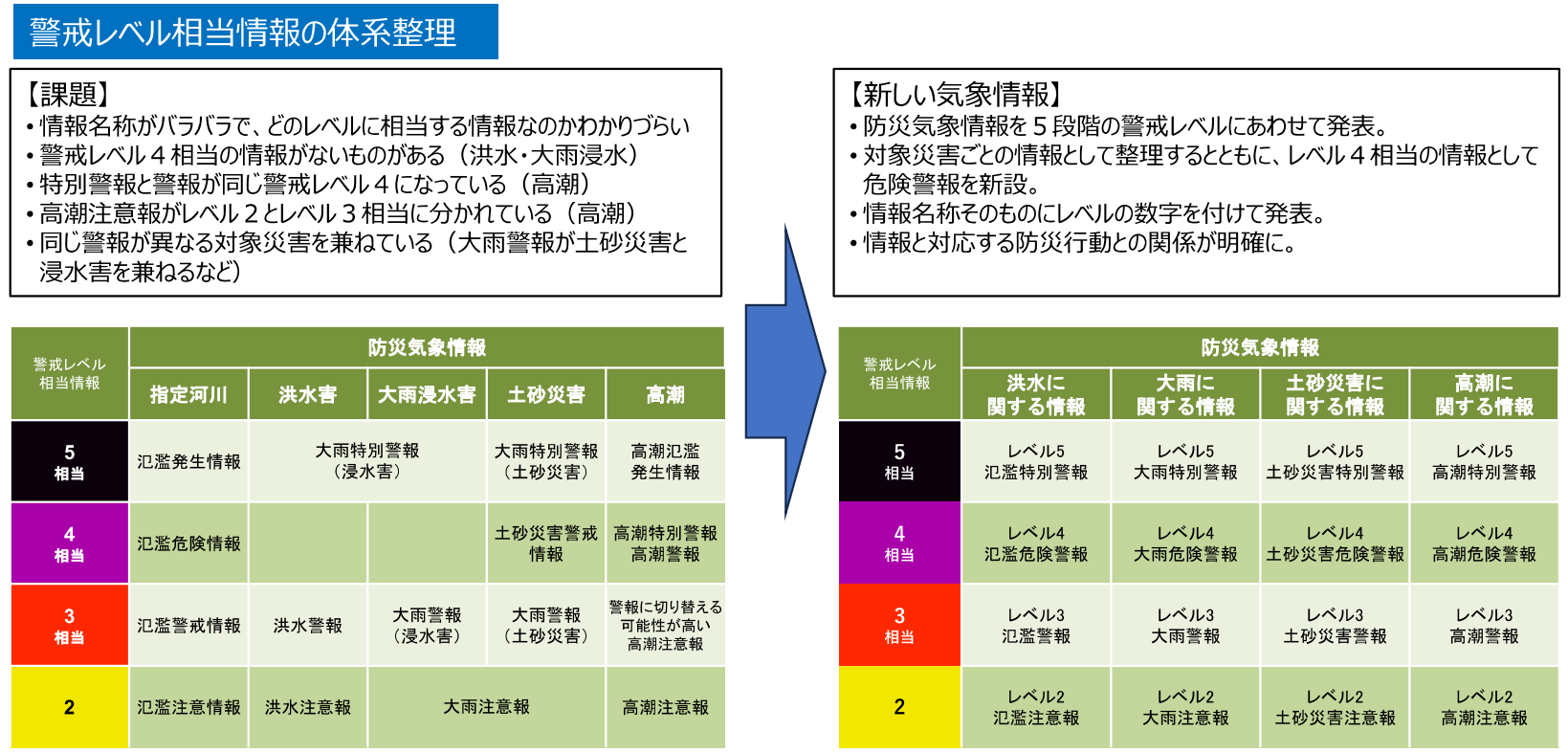 今回の改定では、これまでバラバラだった災害ごとの防災気象情報の呼称を統一したことにより、より分かりやすく危険度が伝わるよう変更を行っています。